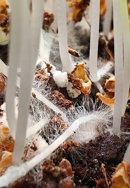 Waarschijnlijk is het geen schimmel maar wortelharen.